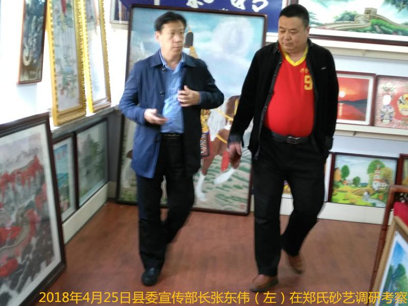 2018年4月25日,興隆縣委常委、宣傳部長、統(tǒng)戰(zhàn)部長張東偉來到公司,就鄭氏砂藝創(chuàng)新發(fā)展、新產(chǎn)品研發(fā)工作進(jìn)行調(diào)研考察。張部長在參觀了車間、展廳之后強(qiáng)調(diào):鄭氏砂藝要緊盯市場,抓好創(chuàng)新發(fā)展工作,尤其要加快抓好旅游紀(jì)念品的研發(fā)工作,創(chuàng)新產(chǎn)品種類,用以豐富興隆的旅游市場,也用來提高企業(yè)的經(jīng)濟(jì)效益。宣傳部副部長、文明辦主任馬宏罡、鄭氏砂藝文化有限公司總經(jīng)理鄭鐵軍陪同調(diào)研考察。