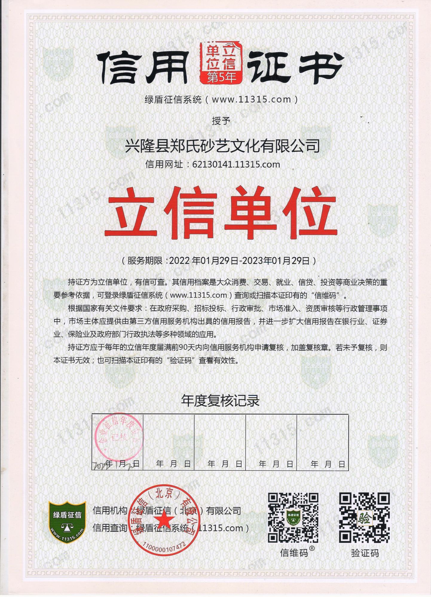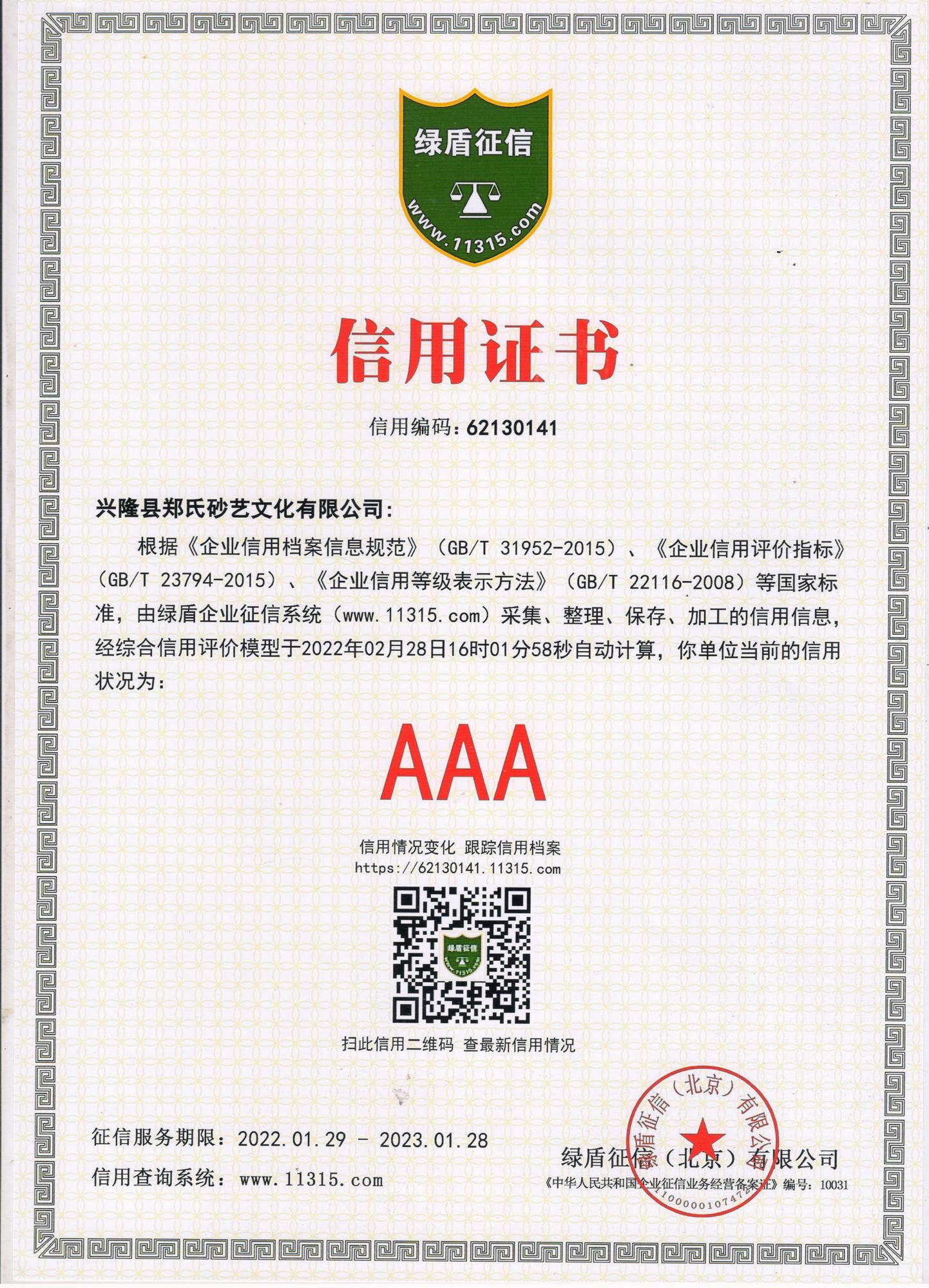 2022年,根據綠盾企業征信系統(www.11315.com)采集、整理、保存、加工的信息,經綜合信用評價模型自動評估,興隆縣鄭氏砂藝文化有限公司被評為AAA級信用企業,并授予綠盾征信“信用證書”,企業已連續五年獲此殊榮。