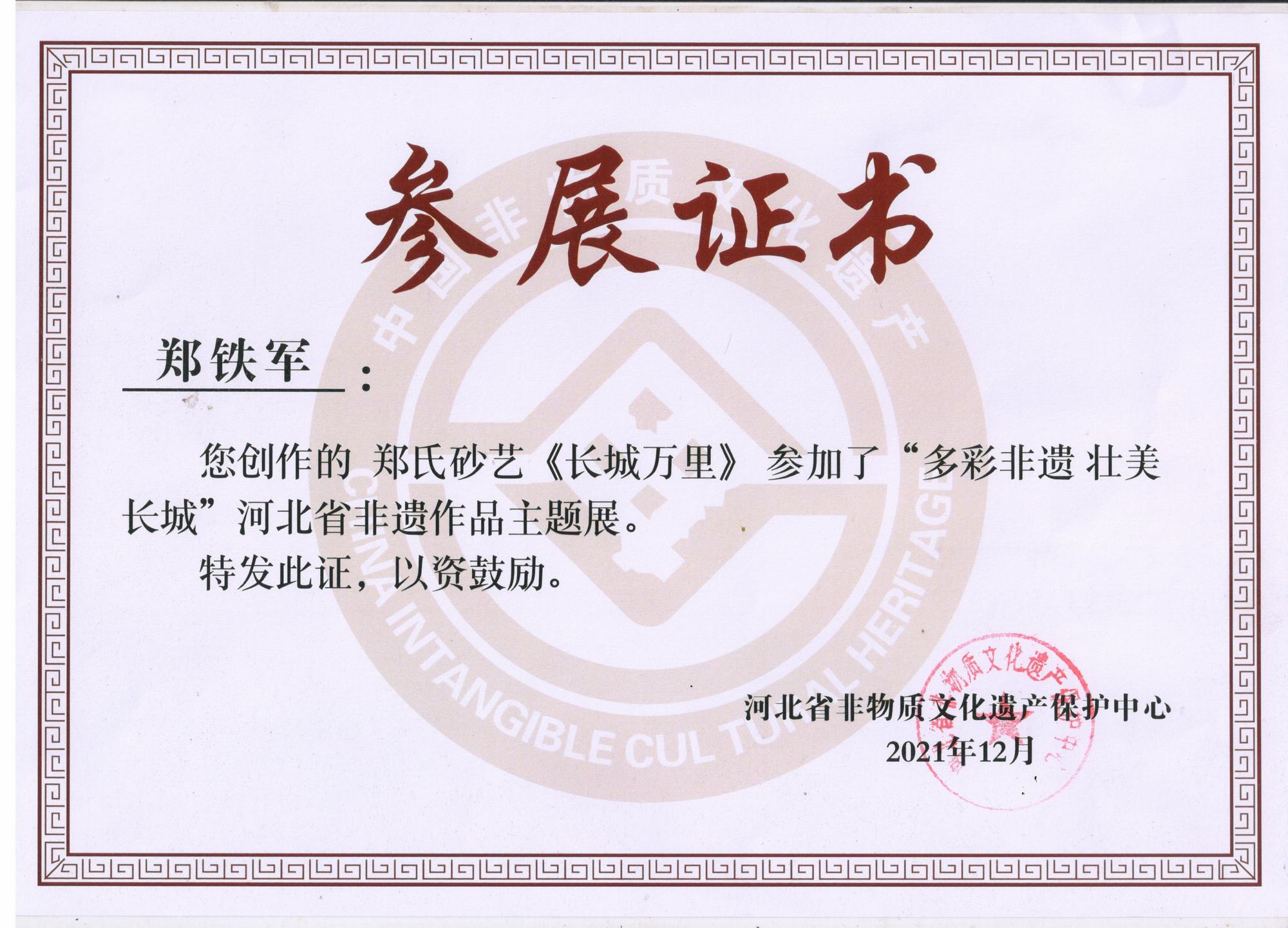 近期,鄭氏砂藝多次應邀參加了省、市相關單位舉辦的各項展出活動,參展的非遺砂畫作品和研發的旅游商品得到了社會各界人士的一致好評,被活動組委會給予了很大的肯定,在一定程度上提高了我縣和“非遺”文化鄭氏砂藝的知名度。2021年12月,鄭鐵軍董事長的砂畫作品《長城萬里》入選“多彩非遺 壯美長城”河北省非遺作品主題展,并在河北省“非遺”保護中心展出。2022年1月,鄭氏砂藝砂畫作品《薪火相傳》榮獲“弘揚塞罕壩精神文創產品大賽”一等獎。2022年1月,鄭氏砂藝多項作品在承德市旅游協會舉辦的“傳承非遺手工技藝、助力鄉村振興”活動榮獲獎項。2022年2月,鄭氏砂藝董事長鄭鐵軍在全市開展的“鄉村振興黨旗紅 文藝創新樹先鋒”活動中表現突出,榮獲“承德市2021年度優秀鄉村文藝家會員”稱號。