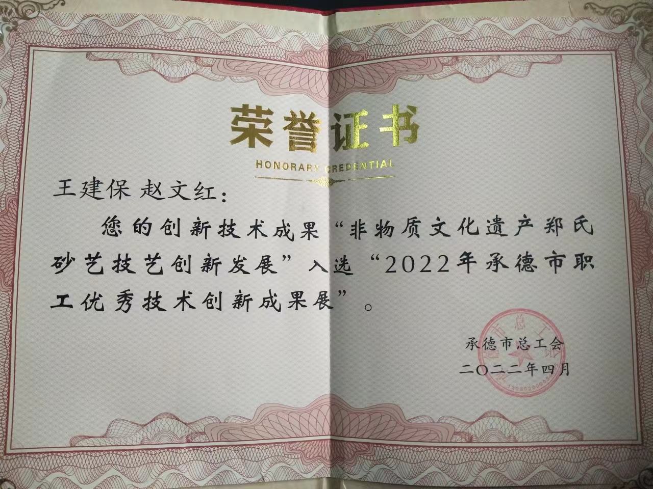 近年來鄭氏砂藝以創(chuàng)新發(fā)展為根本,不斷加大創(chuàng)新研發(fā)投入,引進(jìn)人才技術(shù),聘請?jiān)迦A大學(xué)文化與旅游產(chǎn)品設(shè)計(jì)研發(fā)中心總監(jiān)尹建民教授為鄭氏砂藝技術(shù)顧問,創(chuàng)新研發(fā)出多種旅游紀(jì)念品,并提升改進(jìn)砂畫制作工藝,使“非遺”砂畫技術(shù)和質(zhì)量不斷提高,期間研發(fā)的9項(xiàng)實(shí)用新型專利被國家知識產(chǎn)權(quán)局認(rèn)定,新產(chǎn)品多次參加國家、省、市地區(qū)舉辦的文化產(chǎn)業(yè)博覽會(huì),并榮獲“中國十大最具文化創(chuàng)意旅游紀(jì)念品”、“最具創(chuàng)意的工藝品”、“河北省十佳旅游紀(jì)念品”和“承德珍品”等百余項(xiàng)榮譽(yù),倍受中外廣大客戶青睞。企業(yè)先后榮獲“河北省科普示范基地”、“河北省文化產(chǎn)業(yè)示范基地”、“河北省科技型中小企業(yè)”、“河北省誠信企業(yè)”、“河北省巧手脫貧示范基地”、“中國低碳綠色創(chuàng)新企業(yè)”和“河北省非遺扶貧就業(yè)工坊”等眾多稱號。目前,產(chǎn)品已成功走向美國、英國、法國、德國、俄羅斯、東南亞等多個(gè)國家和地區(qū)。