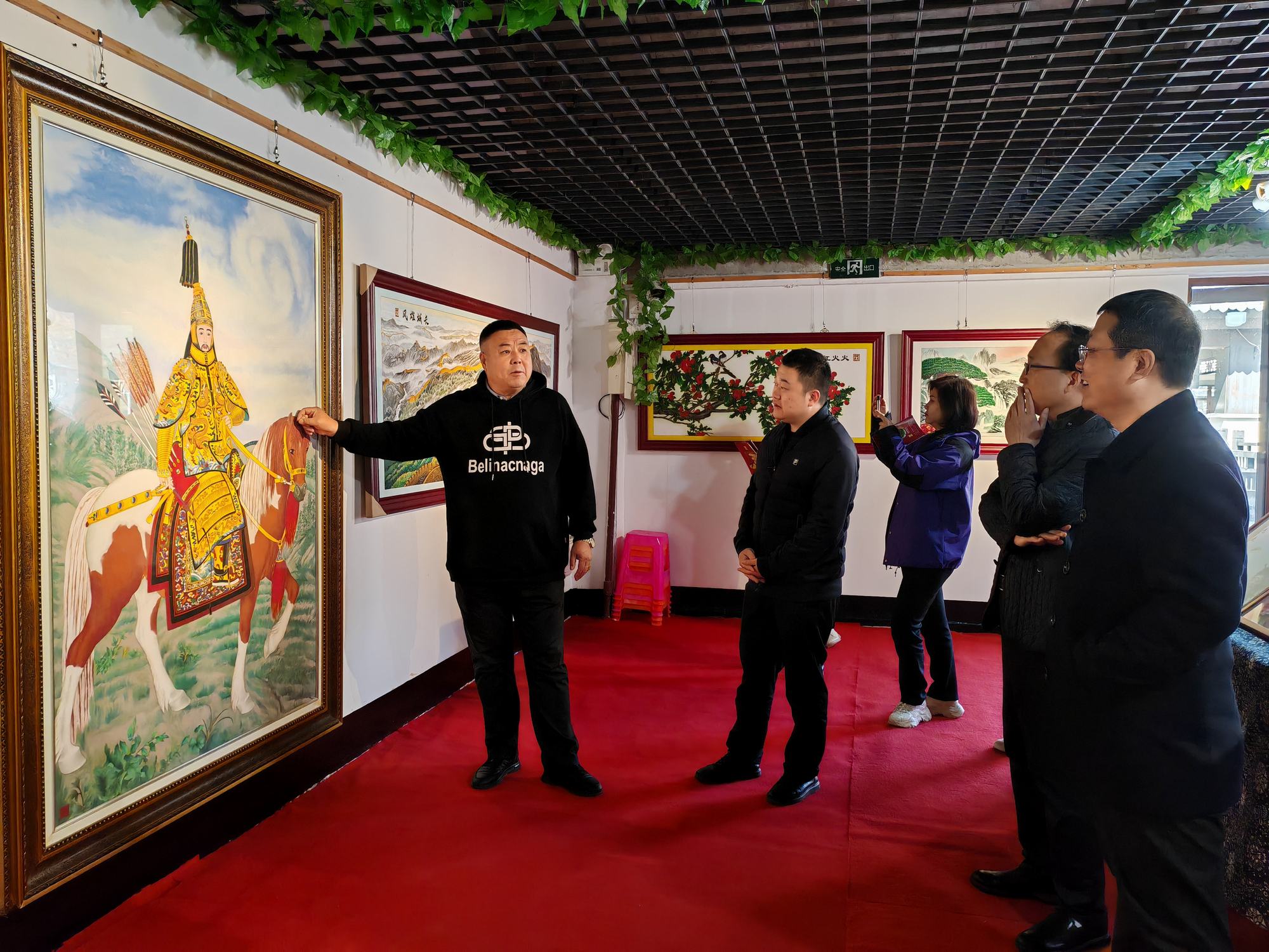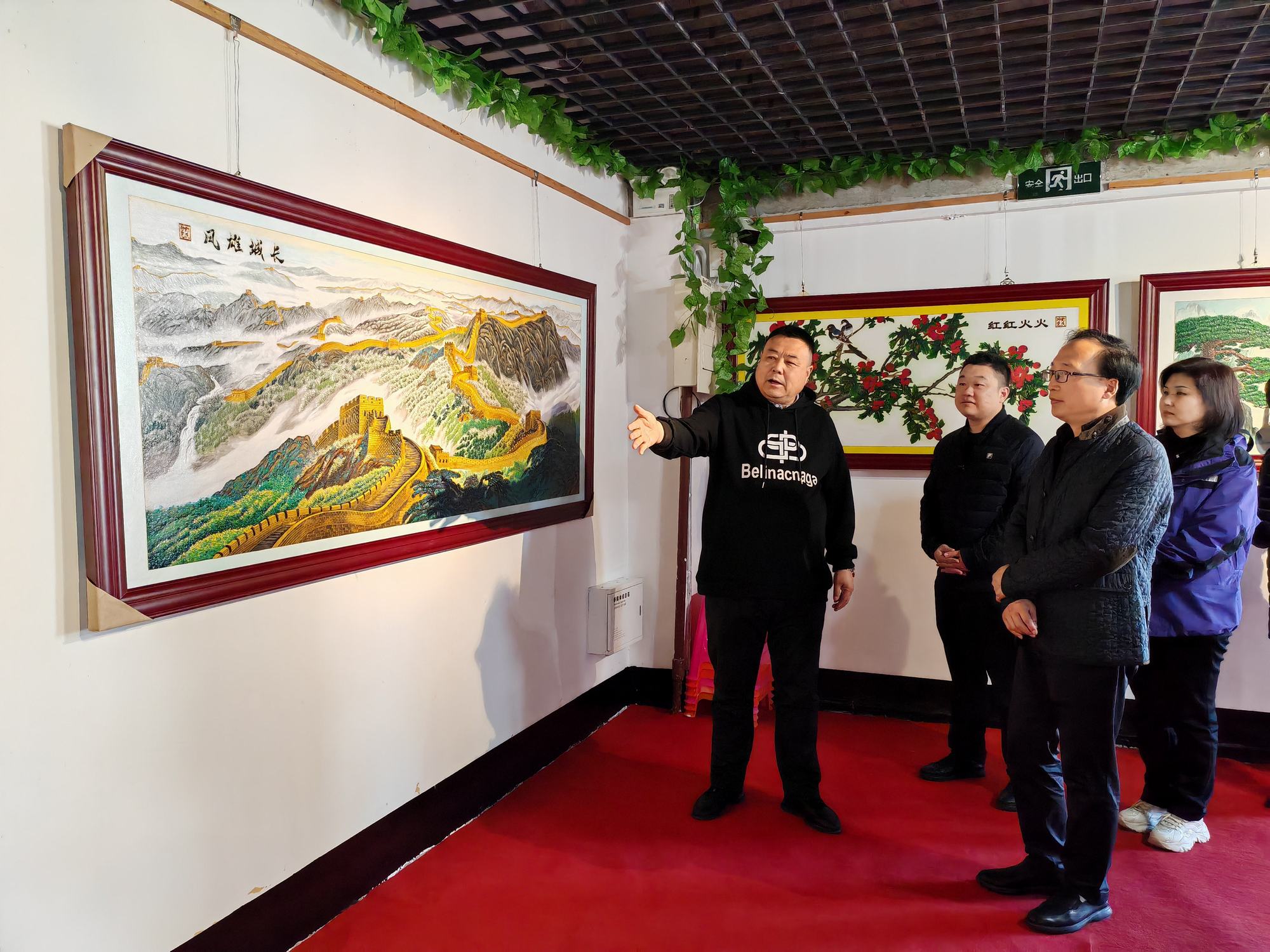 集乾釗主任一行在鄭鐵軍董事長的陪同下參觀了鄭氏砂藝非遺展館,觀看了鄭氏砂藝創作的各類非遺砂畫作品,考察團領導在長城砂畫系列前駐足欣賞,對栩栩如生的長城砂畫作品給予了高度贊譽。期間董事長鄭鐵軍對近年來鄭氏砂藝非遺文化的發展情況進行了簡單介紹。集乾釗主任對鄭氏砂藝非遺文化的傳承和發展表示了充分肯定,并對鄭氏砂藝的傳統手工技藝給予高度評價。