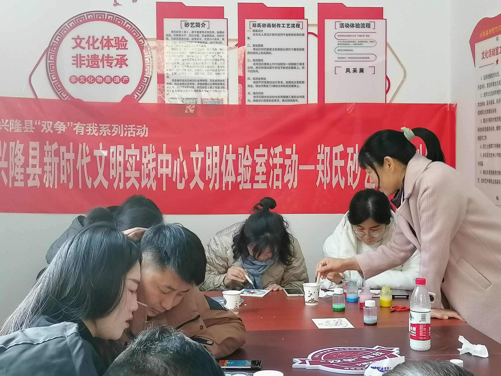2023年11月13日,鄭氏砂藝砂畫技師應邀前往興隆縣新時代文明實踐中心文明體驗室,開展“非遺”鄭氏砂藝(畫)制作體驗活動,據了解,此次活動由中共興隆縣委宣傳部舉辦,是興隆縣“雙爭”有我系列活動之一,主要目的是傳承優秀文化,豐富群眾文化生活,推進“雙爭”活動走深走實,推進基層文化建設,推動藝術文化發展,通過群眾喜聞樂見的文體活動促進地方文化繁榮,真正將文化惠民、服務百姓落到實處。