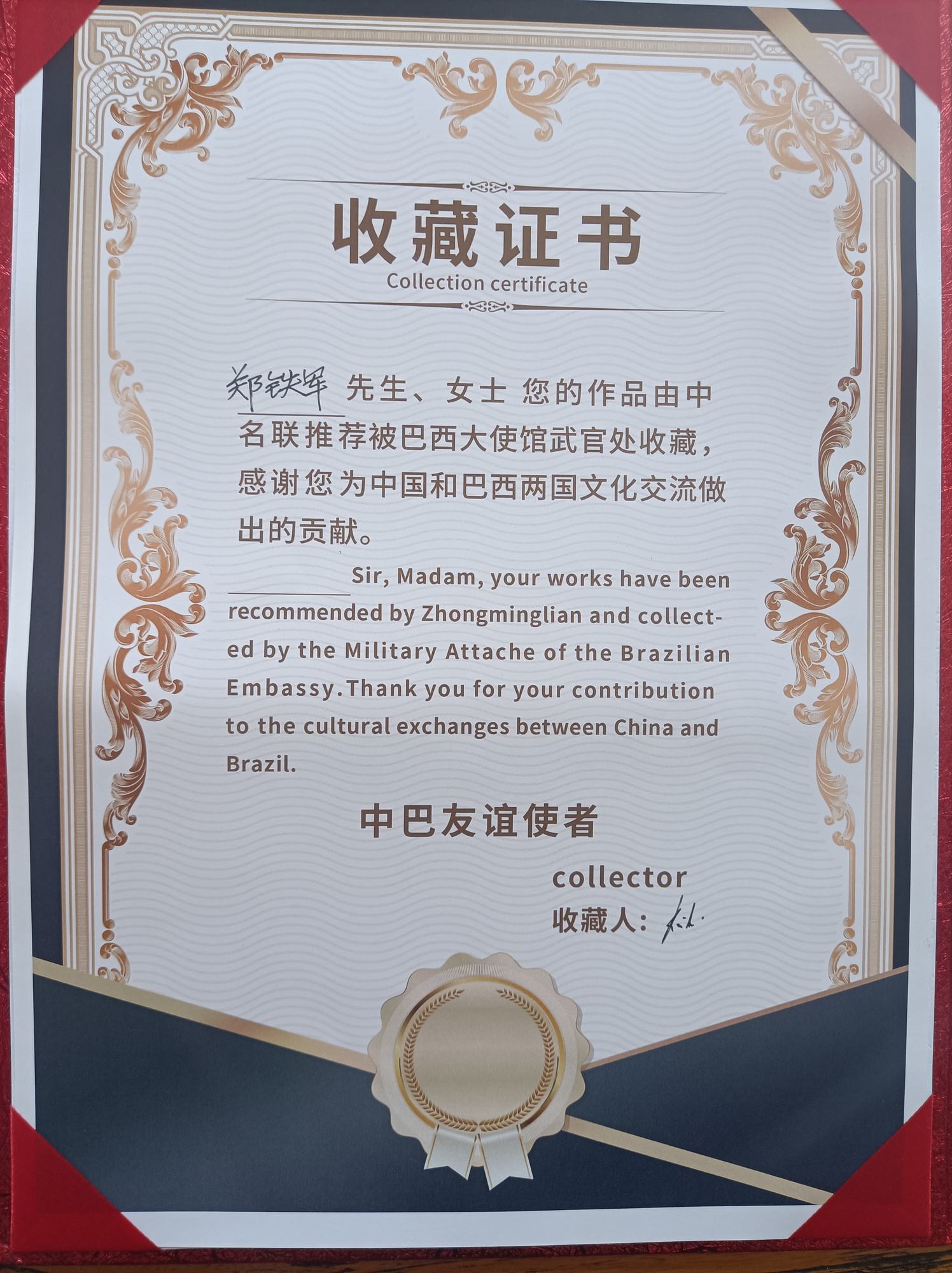 2024年6月7日,應(yīng)巴西駐華大使館邀請(qǐng),鄭氏砂藝(畫(huà))形象代言人劉秀華攜中名聯(lián)簽約國(guó)禮藝術(shù)家鄭鐵軍老師的作品到使館進(jìn)行文化交流,巴西外交官對(duì)鄭鐵軍老師的作品高度評(píng)價(jià),對(duì)鄭鐵軍老師作品所蘊(yùn)含的深厚的中華傳統(tǒng)文化底蘊(yùn)極其贊賞,現(xiàn)場(chǎng)把鄭鐵軍老師作品《興隆山》作為國(guó)禮珍藏,贈(zèng)送全球友華政要。巴西駐華大使館現(xiàn)場(chǎng)為中名聯(lián)簽約國(guó)禮藝術(shù)家鄭鐵軍老師頒發(fā)了中巴文化交流使者收藏證書(shū)。