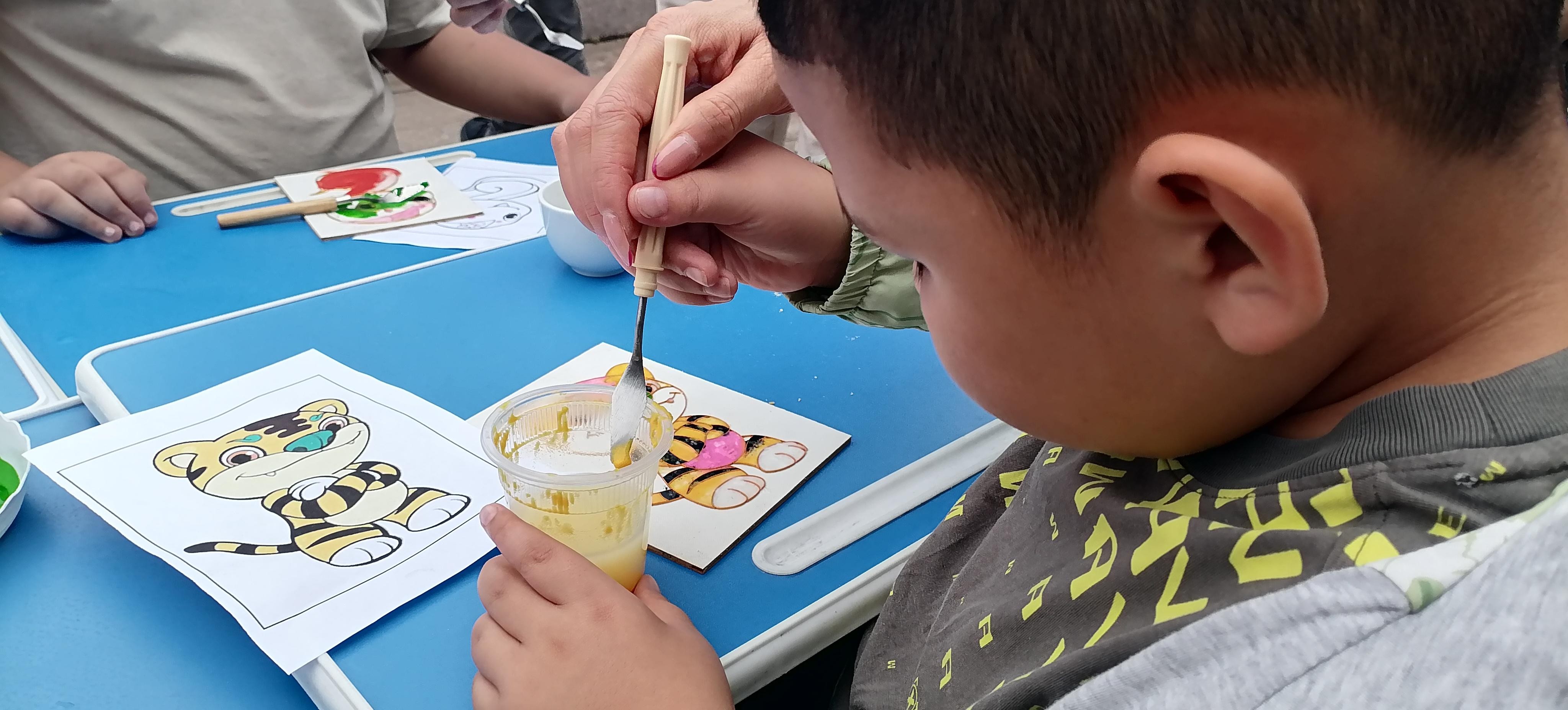 活動(dòng)現(xiàn)場(chǎng),鄭氏砂藝的“天然彩砂+金銀絲”工藝成為孩子們的“興趣焦點(diǎn)”。作為興隆縣的省級(jí)非遺項(xiàng)目,鄭氏砂藝以天然礦物彩砂為原料,采用金絲銀線勾勒?qǐng)D案輪廓,再填充彩砂的傳統(tǒng)手法,既保留了鄉(xiāng)土文化特色,又蘊(yùn)含著非遺技藝的巧思。為讓孩子們輕松參與,技師們特意提前制作了粘好金絲的半成品——一幅幅待填充的砂畫作品,將“最精彩的創(chuàng)作環(huán)節(jié)”留給孩子。“我要給小虎的臉涂綠色!”“我喜歡藍(lán)色的眼睛!”孩子們圍坐桌前,手持作畫小鏟,認(rèn)真地將色彩砂石填入金絲框架,同時(shí)互相交流“配色秘訣”,現(xiàn)場(chǎng)充滿了童真與熱鬧。