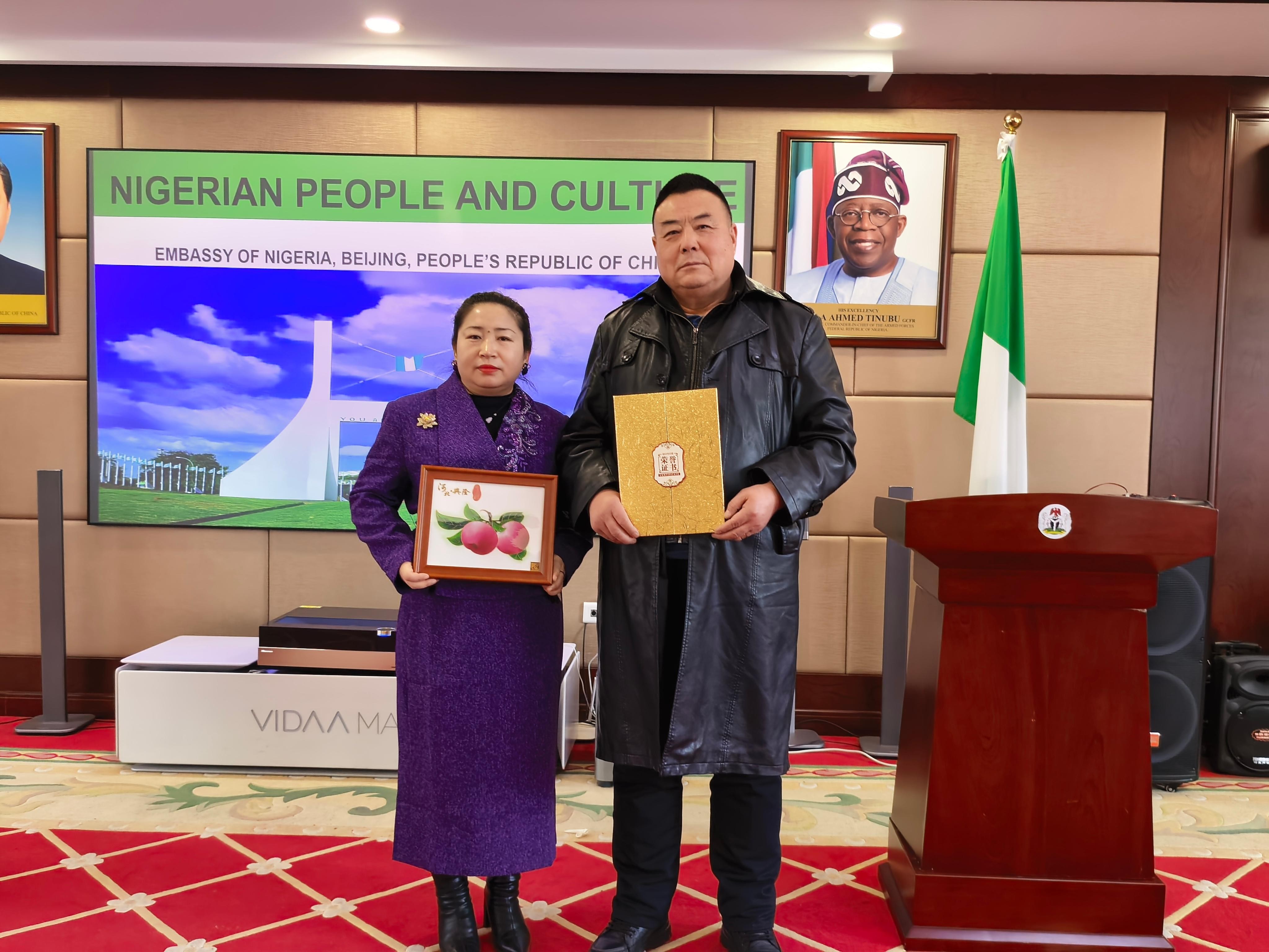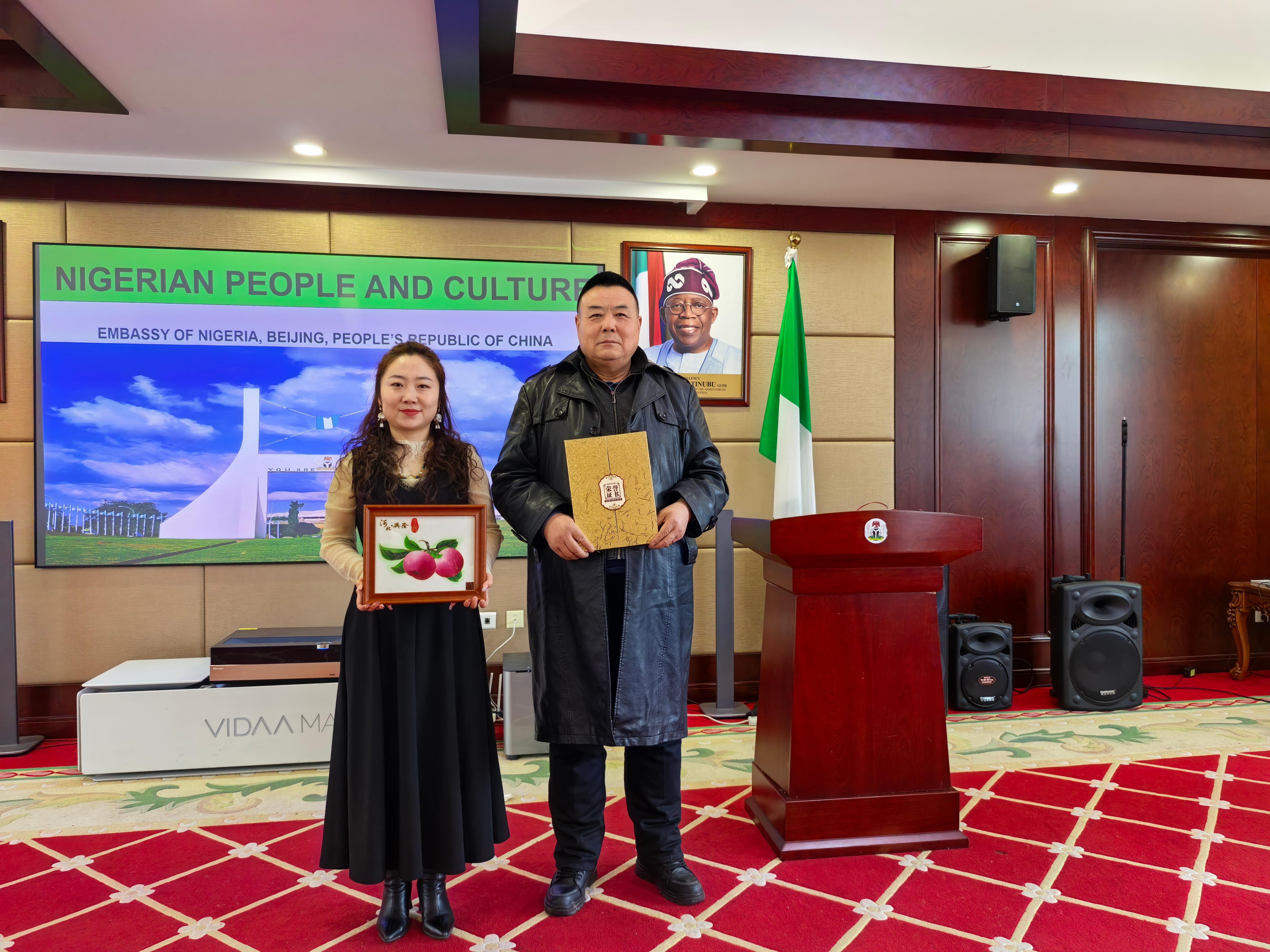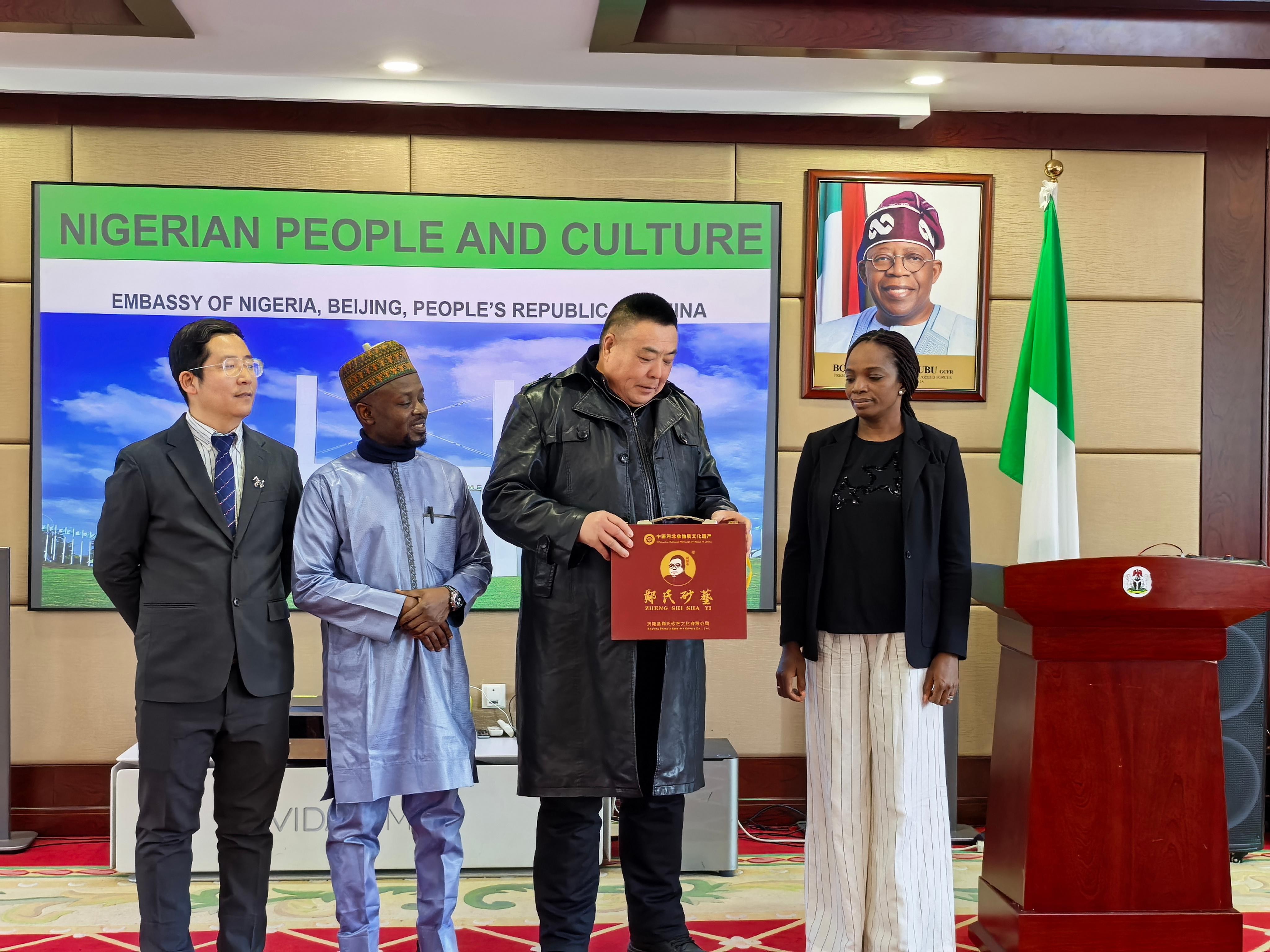 鄭鐵軍老師介紹道:“鄭氏砂藝起源于晚清秀才鄭克祥,歷經(jīng)百年時光沉淀與五代匠人的薪火相傳,于21世紀(jì)初成功躋身省級非物質(zhì)文化遺產(chǎn)名錄。該砂藝原料采自燕山腳下的彩色礦山,經(jīng)精細(xì)研磨后,再經(jīng)設(shè)計、制圖、掐絲、點(diǎn)藍(lán)、封裝等多道工序悉心雕琢,每件作品都承載著燕趙大地深厚的文化基因。此次收藏的砂藝作品《平安》更是寓意平安、吉祥與和諧,象征兩國發(fā)展蒸蒸日上。”尼日利亞駐華大使對這件砂藝作品贊不絕口,由衷贊嘆道:“這件作品讓我深切感受到中華文化的博大精深。”大使當(dāng)場宣布收藏這件作品,并簽字留念,同時表示:“鄭氏砂藝融合自然與人文,彰顯中國文化魅力;中尼文化交流搭建起相互了解的橋梁,期待更多非遺項(xiàng)目互鑒互融。我將把這件作品陳列在使館文化區(qū),以此見證中尼文化交流的深厚情誼。”