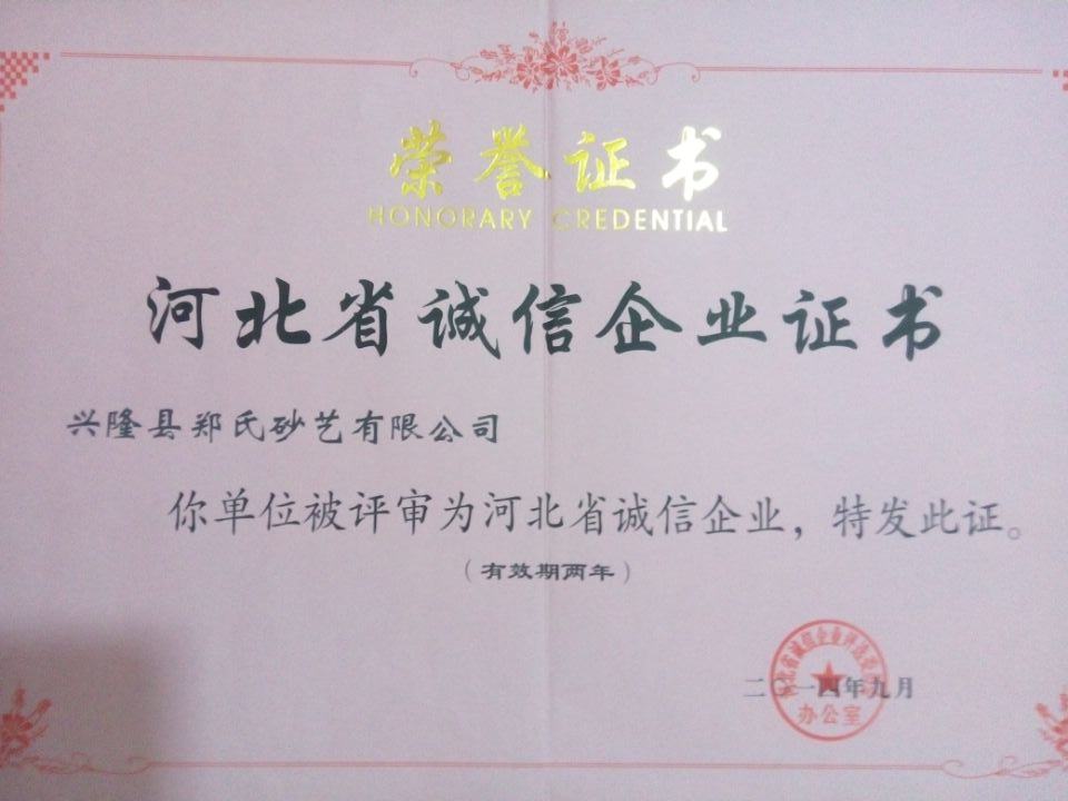 2014年9月26日,鄭氏砂藝有限公司被評為2014年“河北省誠信企業(yè)”,公司的事跡同時錄入《河北省企業(yè)誠信建設成果集》一書中。“河北省誠信企業(yè)建設交流會”暨“河北省誠信企業(yè)”授牌儀式9月26日在省會石家莊凱旋金悅大酒店舉行,公司總經理鄭鐵軍參加了授牌儀式。鄭鐵軍總經理同時被評為“2014年度河北省企業(yè)誠信建設優(yōu)秀工作者”。