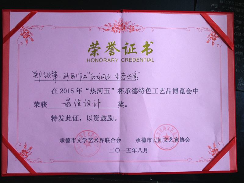 2015年8月,承德市文學(xué)藝術(shù)界聯(lián)合會和承德市民間文藝家協(xié)會舉辦了,2015年“熱河玉”杯承德特色工藝品博覽會,鄭氏砂藝文化有限公司總經(jīng)理鄭鐵軍的砂畫作品“后龍風(fēng)水 生態(tài)興隆”榮獲《最佳設(shè)計(jì)獎》。
